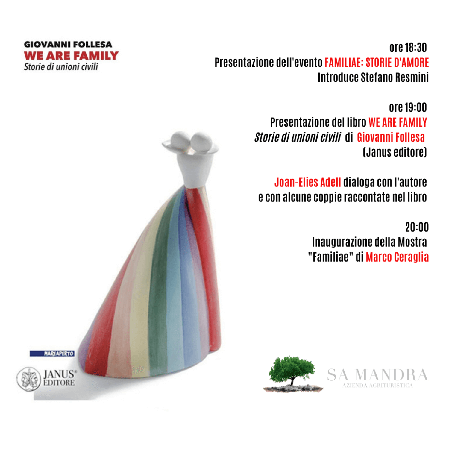 In questo evento Nàrami ha fatto il raddoppio, ma uno solo sarà l’argomento. Giovanni Follesa, chiacchiererà con Joan-Elies Adell del suo libro, “We are family, storie di unioni civili”. Marco Ceraglia con “Familiae”, proporrà un nuovo capitolo dei suoi ritratti di famiglia.
